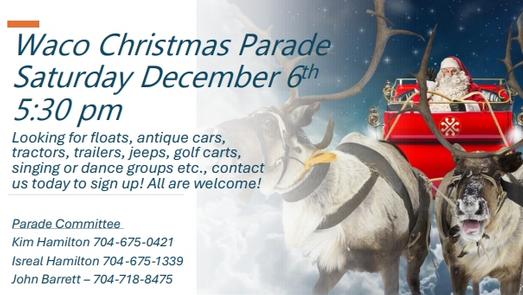 The Town of Waco is located in the eastern portion of Cleveland County in the Piedmont region of North Carolina. The community was first known as “Ramsey Crossings,” after local farmer, Joe Ramsey. In 1879 a movement was started to establish a Post Office. At the height of the movement, a young man in his twenties, George Washington Kendrick, returned from the Brazos Area of Texas and suggested the town be called “Waco,” after a city along the Brazos River. The community liked its sound, and accepted it as the Town’s official name.