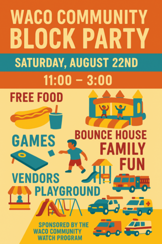 The next Waco Community Watch meeting is scheduled for Tuesday April 7th at 6:30 pm at the Community Center. The meeting is open to the public.